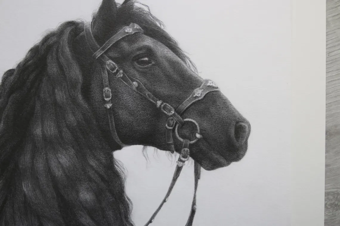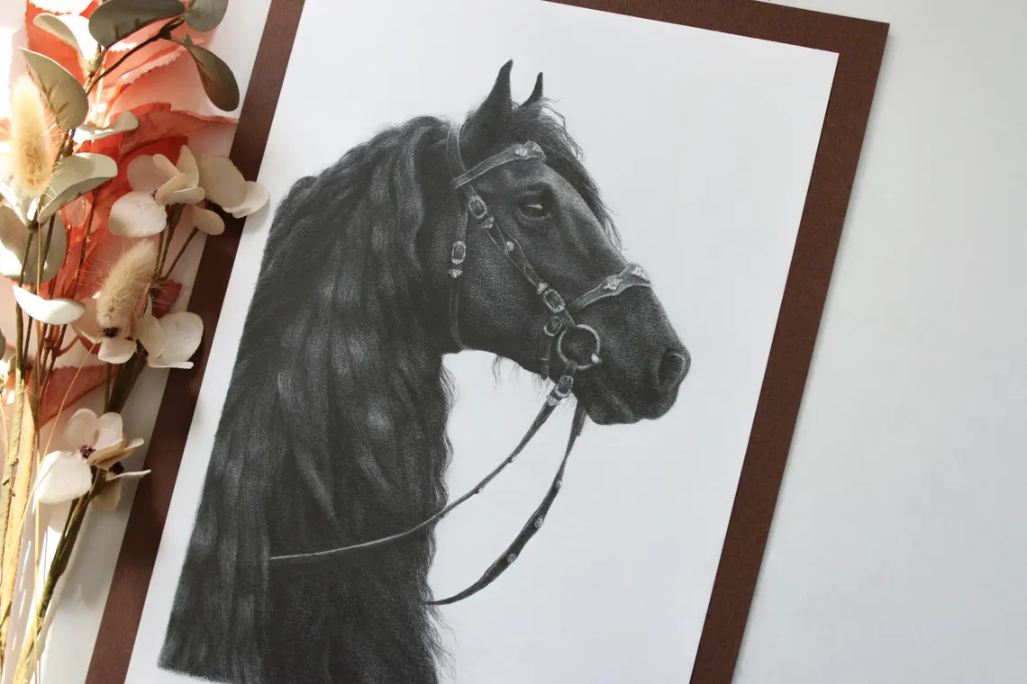 This original pencil drawing depicts a majestic black Friesian horse, rendered with fine detail and graceful precision. The flowing mane, expressive eyes, and elegant posture capture the noble beauty and calm strength of this remarkable breed.