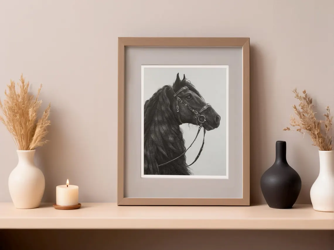 Created entirely by hand with graphite pencils on high-quality textured paper, this artwork combines realism with softness, making it a timeless piece for horse lovers and art collectors alike.