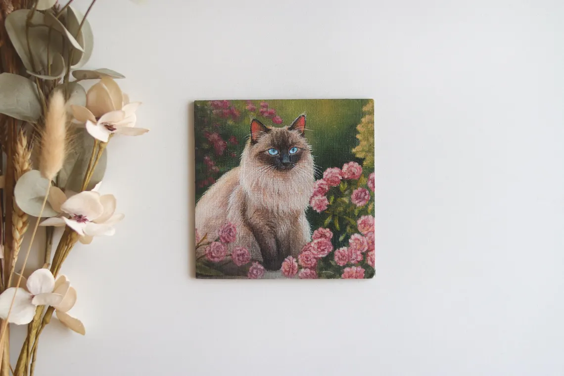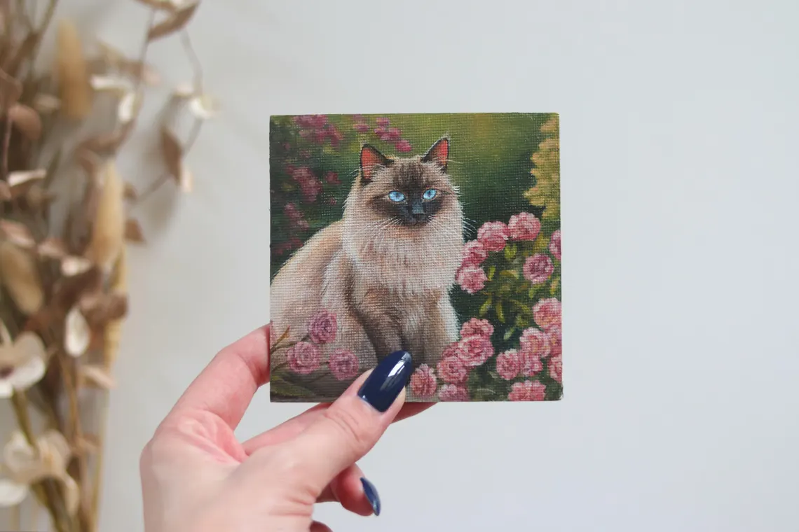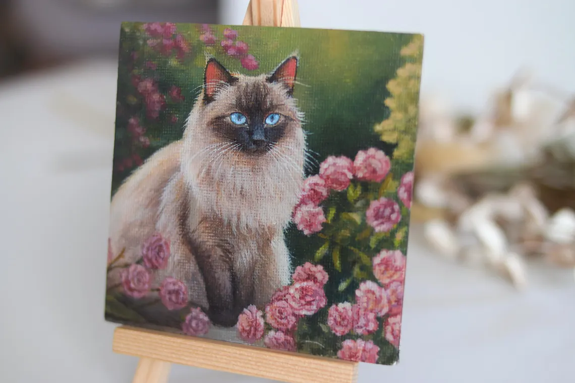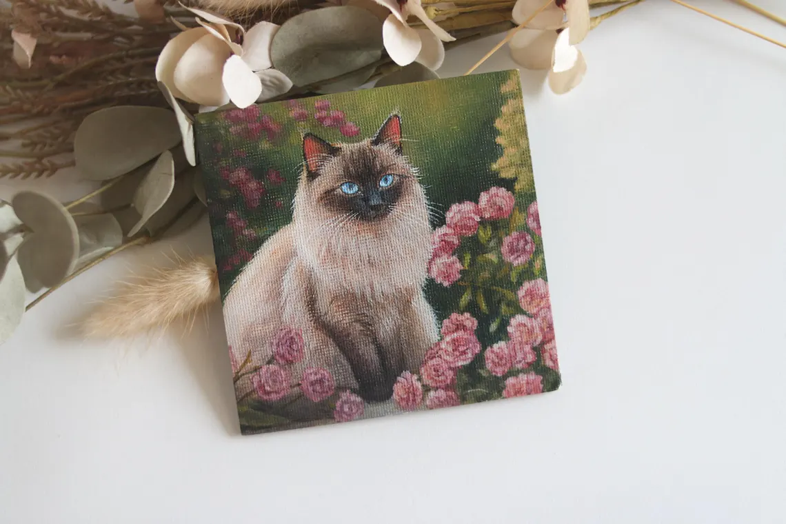 A delicate portrait of a fluffy Siamese (or Ragdoll) cat with striking blue eyes, nestled among blooming pink roses. This miniature painting captures the graceful charm and quiet strength of a feline amidst a garden in full bloom. Hand-painted in acrylics with fine detail and care.