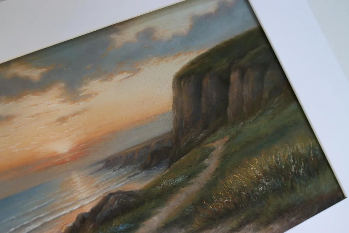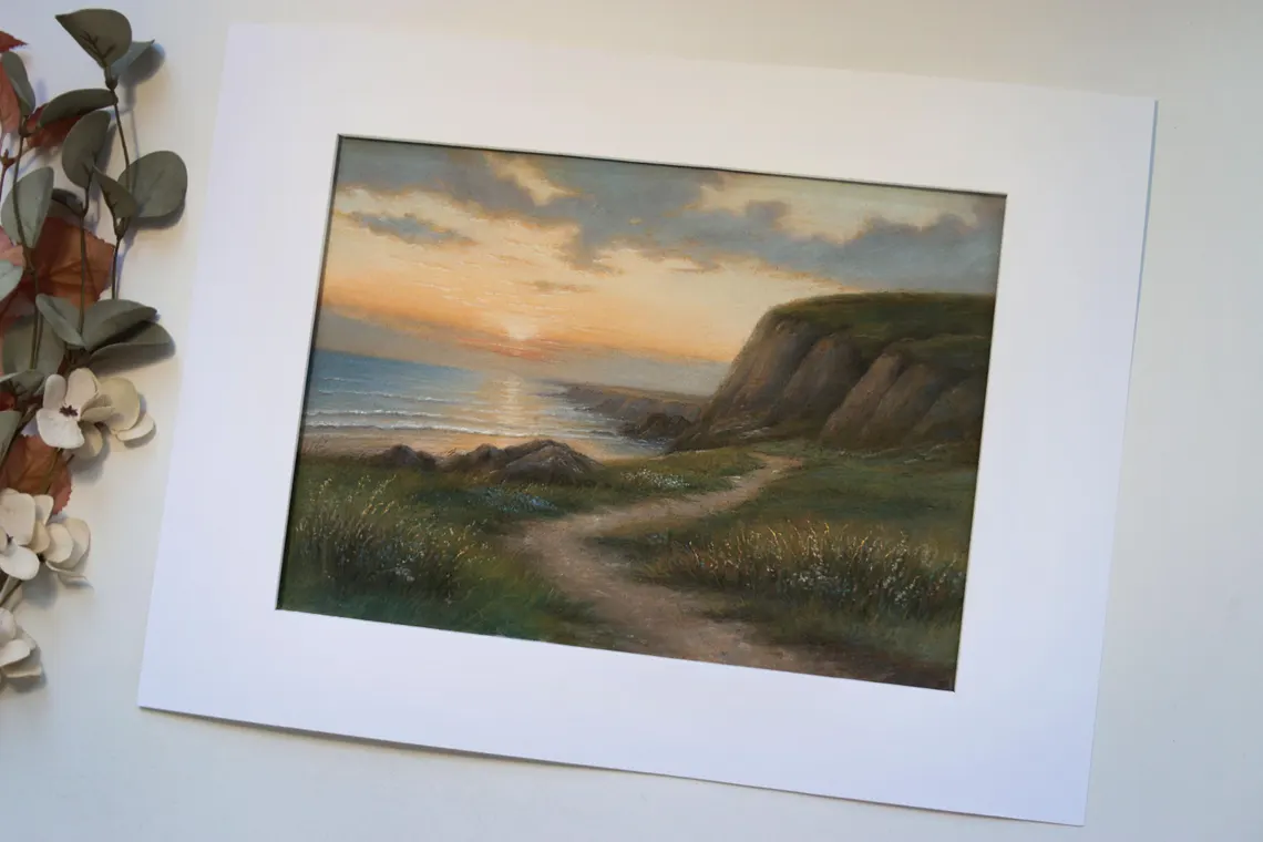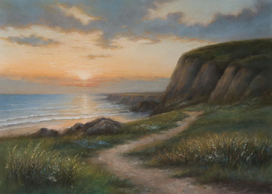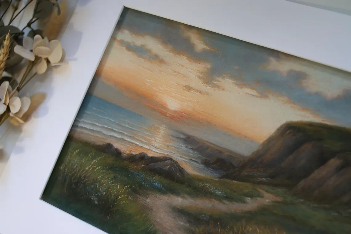 This original pastel painting captures the peaceful beauty of a coastal sunset, with soft golden light reflecting on the sea and a winding path leading along the cliffs. Created with soft pastels on textured paper, the artwork conveys warmth, serenity, and a timeless connection to nature.
