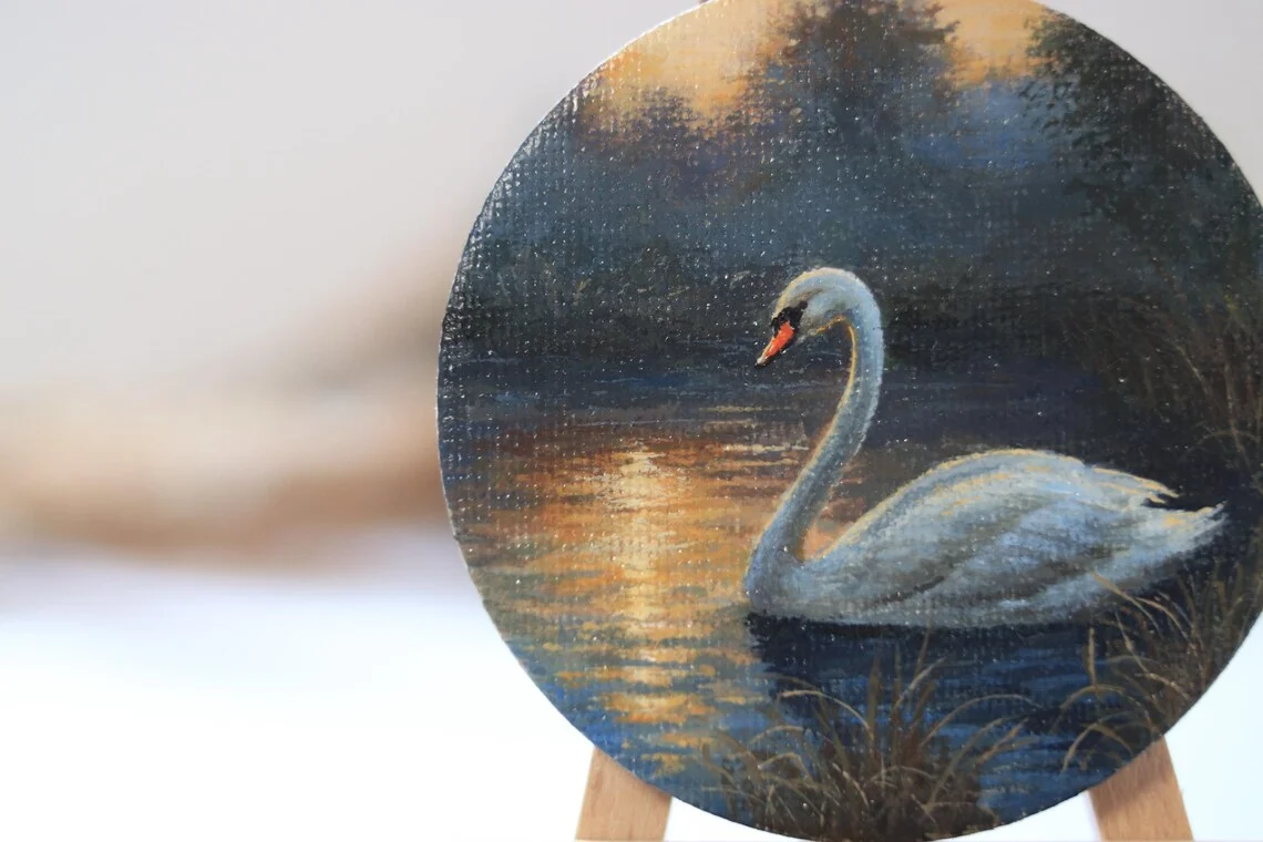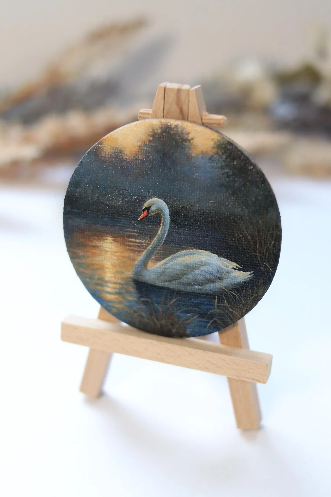 Mini Swan Painting, Serene Lake Sunset Art, Tiny Nature Gift, Acrylic Miniature
