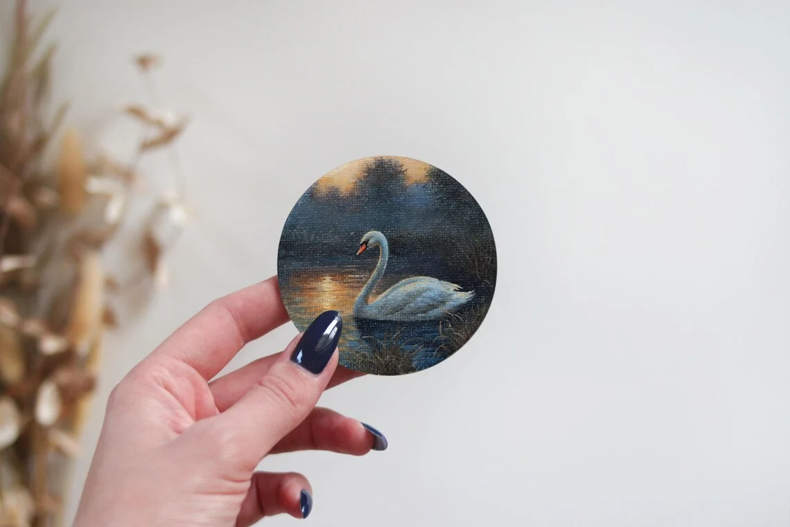 Be the first to review “Mini Swan Painting, Serene Lake Sunset Art, Tiny Nature Gift, Acrylic Miniature”