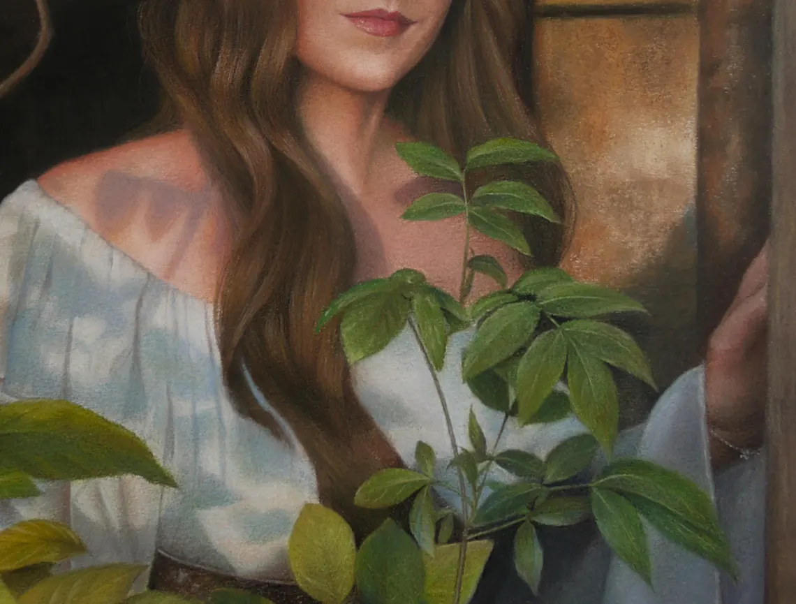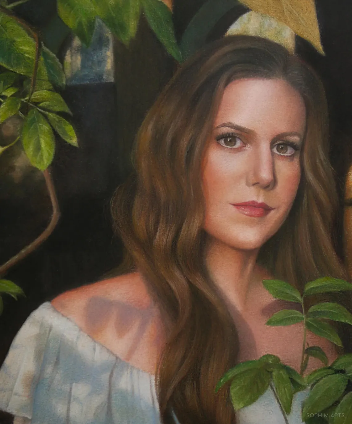 A captivating original pastel portrait of a woman, evoking a sense of mystery and timeless beauty. Her serene gaze and soft flowing hair contrast beautifully against the warm, leafy background, creating an ethereal and poetic atmosphere. Inspired by Renaissance and Gothic aesthetics, this artwork blends realism with fantasy, making it a striking centerpiece for art lovers and collectors alike.