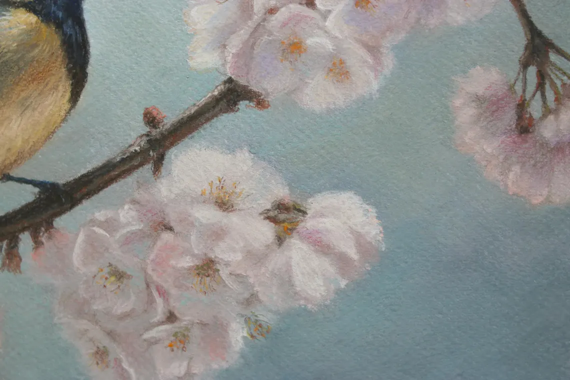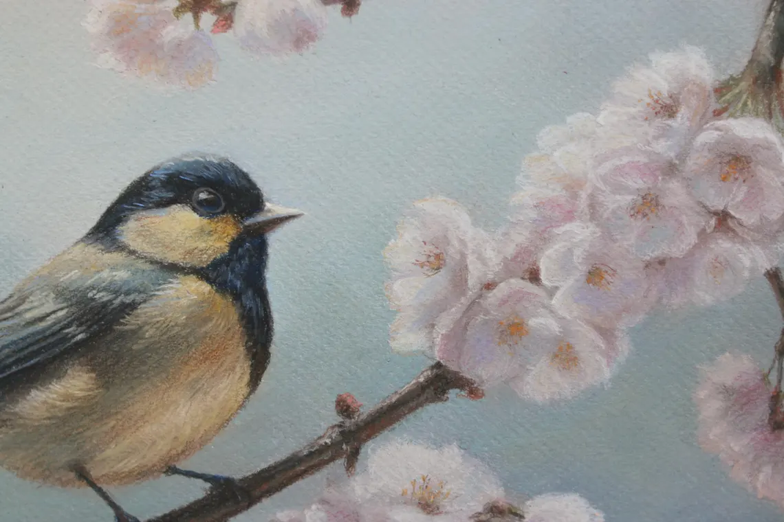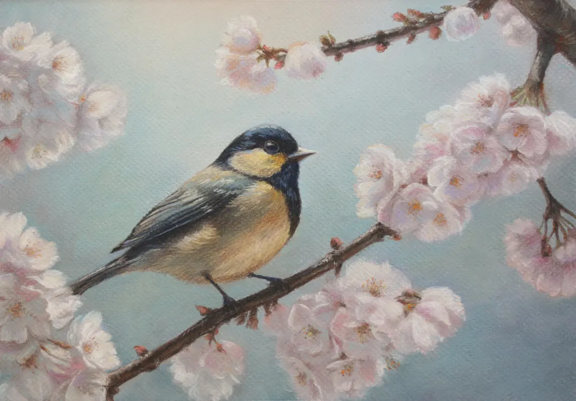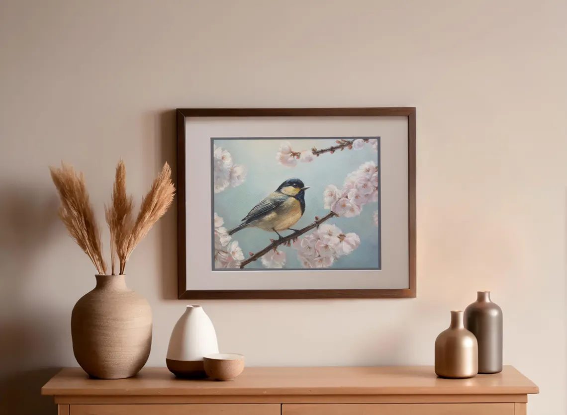 A delicate blue tit perches among soft pink blossoms, capturing the beauty and serenity of spring. Gentle pastel tones create a soothing, warm atmosphere, making this artwork a perfect addition to any living room, bedroom, or workspace. It brings a sense of harmony, freshness, and natural beauty into your home.