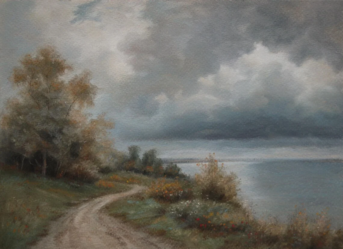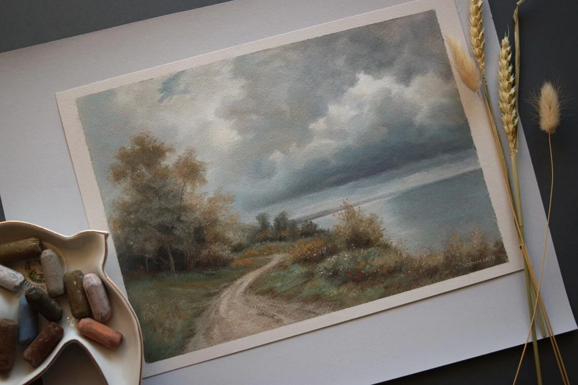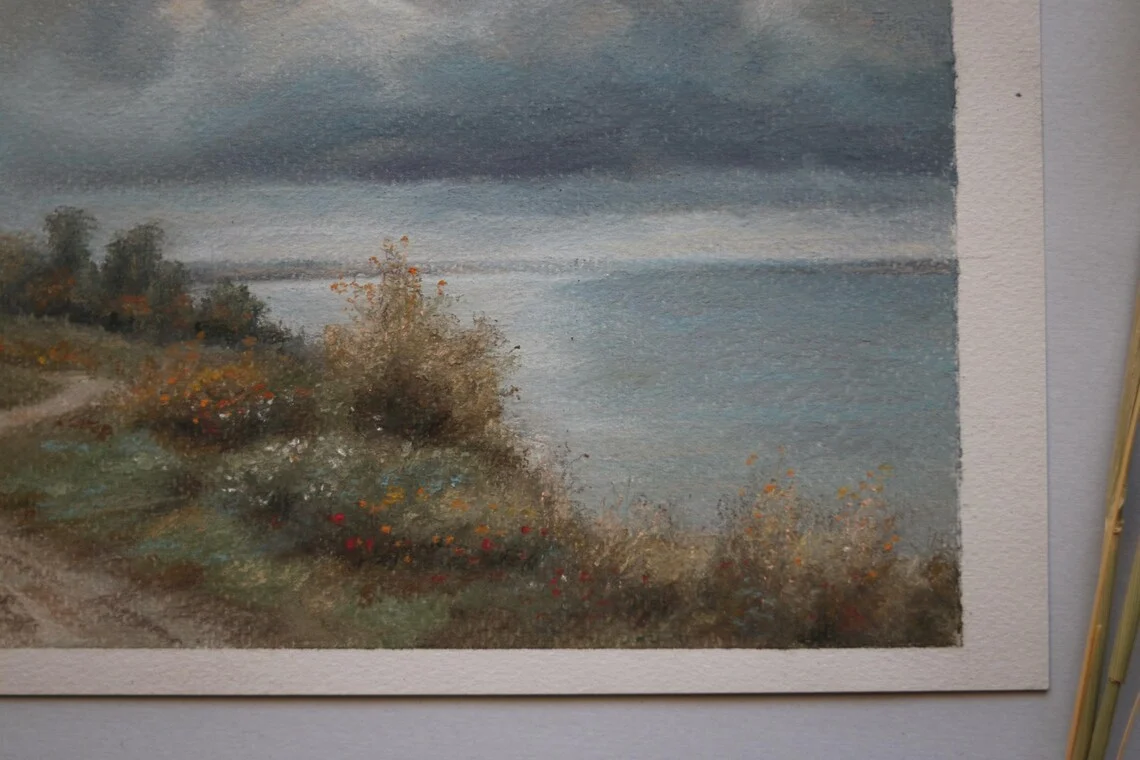 A winding path leads towards the sea, framed by lush greenery and wildflowers, while dramatic storm clouds gather in the sky. This original pastel painting captures the beauty and mood of nature, making it a striking piece for any interior.