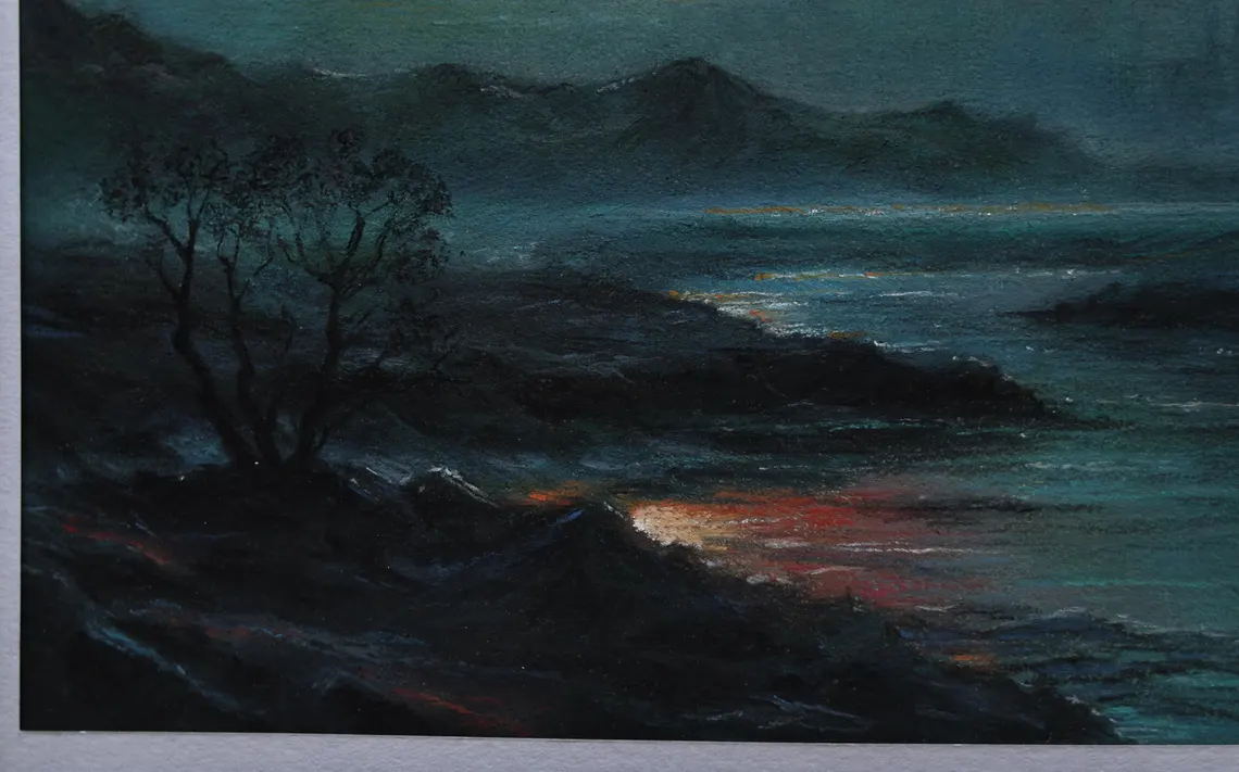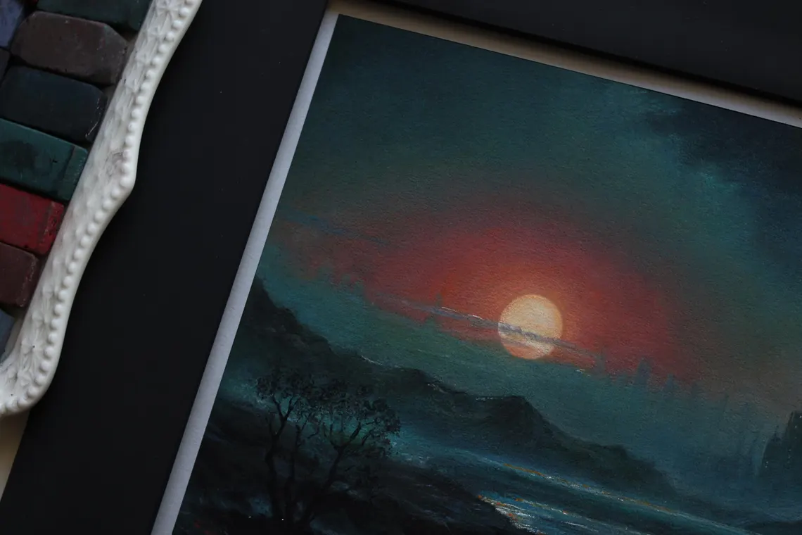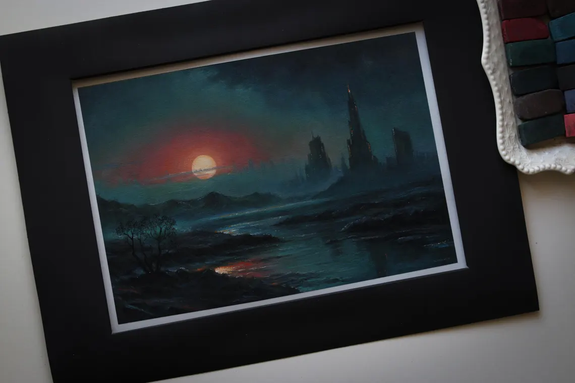 Twilight Ruins – an original pastel painting that captures the haunting beauty of a distant, forgotten world. The crimson sun sets behind dark silhouettes of towering city ruins, casting a reflection over a serene river. The mysterious atmosphere and rich colors invite the viewer to explore this post-apocalyptic vision of retrofuturism. Ideal for those drawn to dystopian landscapes and sci-fi aesthetics.