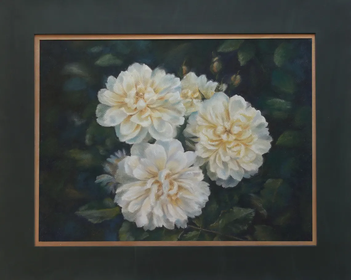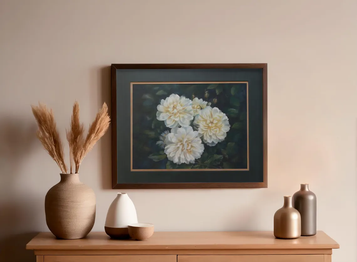Delicate white peonies set against a deep green background create an atmosphere of lightness and tranquility. The realistic details and soft pastel tones bring this artwork to life. Perfect for a living room, bedroom, or cozy reading nook, this piece adds harmony and natural beauty to any space.